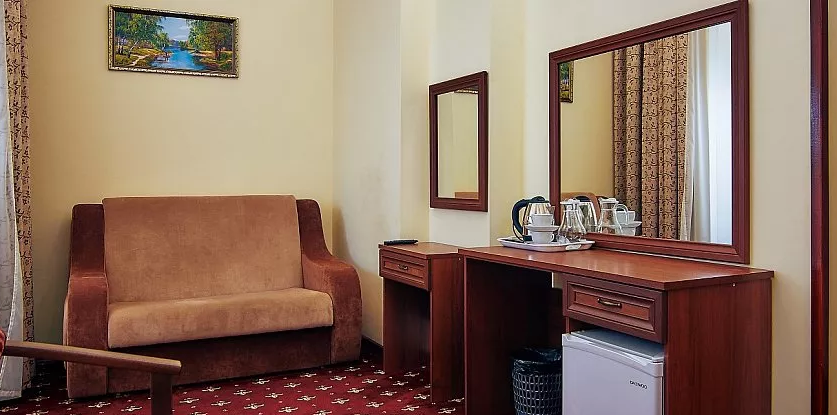 Оснащение номера: электрочайник, чайный набор посуды, холодильник, телефон, ЖК-телевизор, душ, фен, халат, тапочки и полотенца, косметический набор, гигиенические принадлежности.