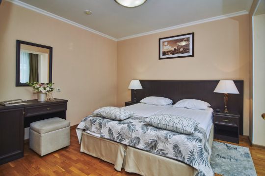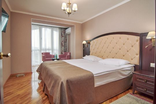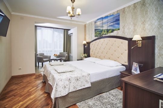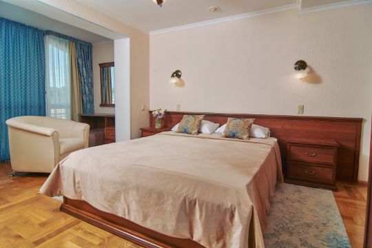 Номер состоит из большой спальни, гостиной, кабинета, оборудованной кухни. Просторный санузел. Красивый вид из окна.